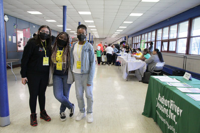 Photo Captions Left to Right: (Student Ambassadors Maritza, Santana, and Saniya /Rover the library mascot taking photos with kids/ Media Educator Zach Reid from the Art Effect talking to parents and students)